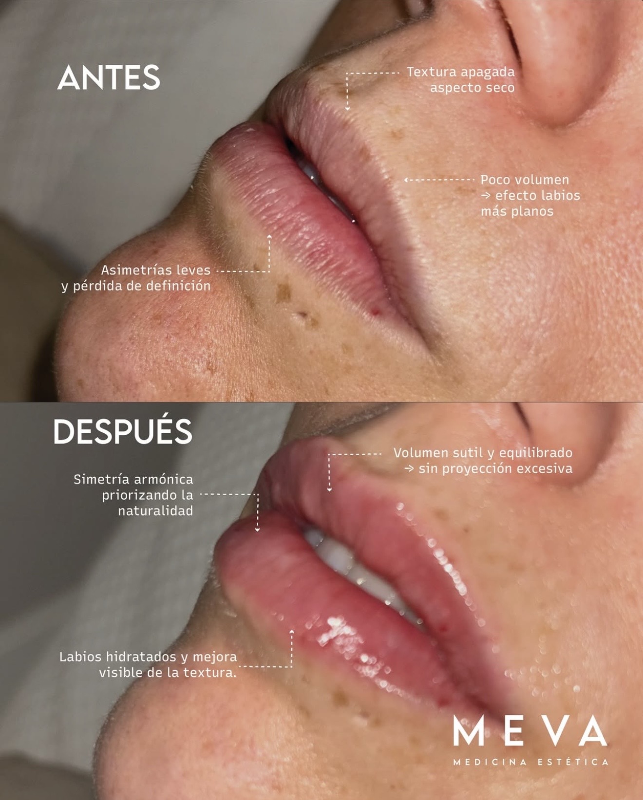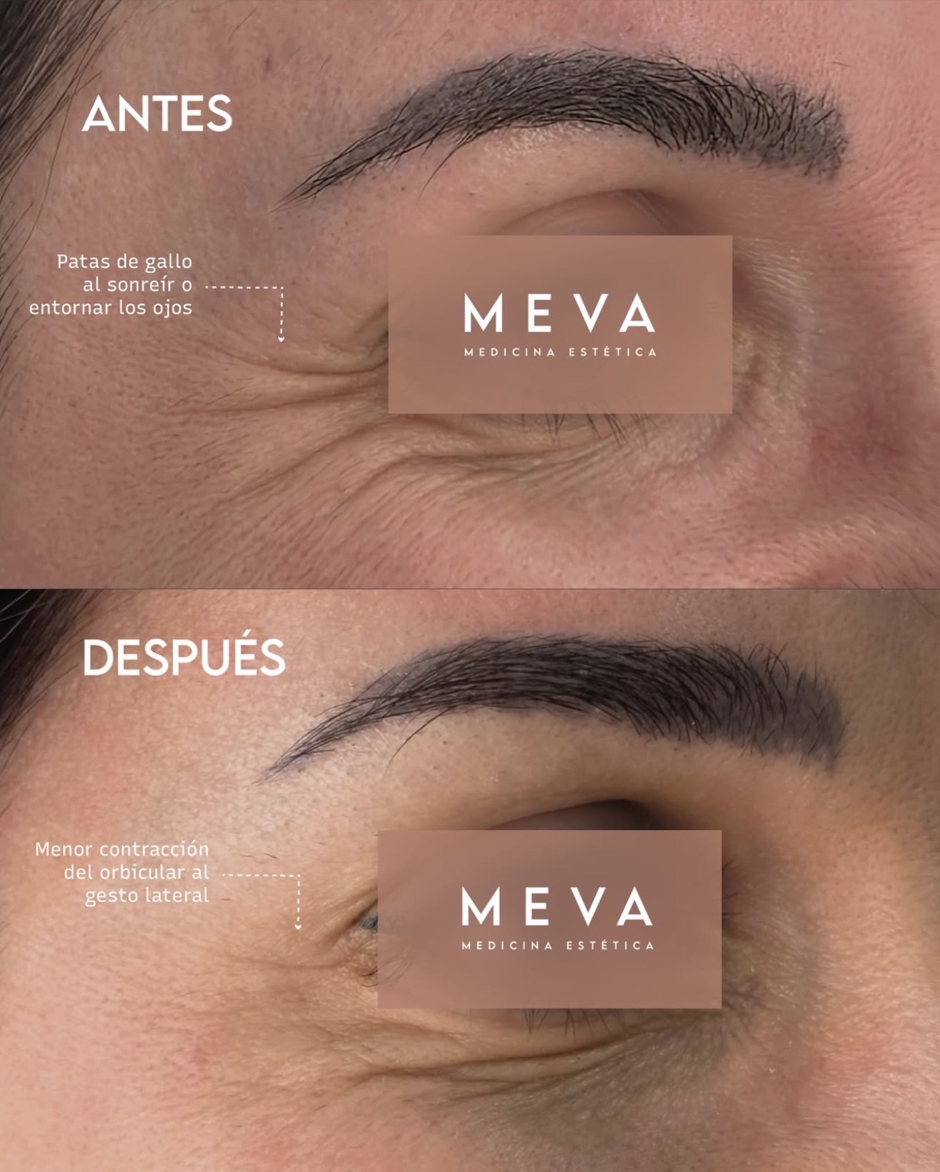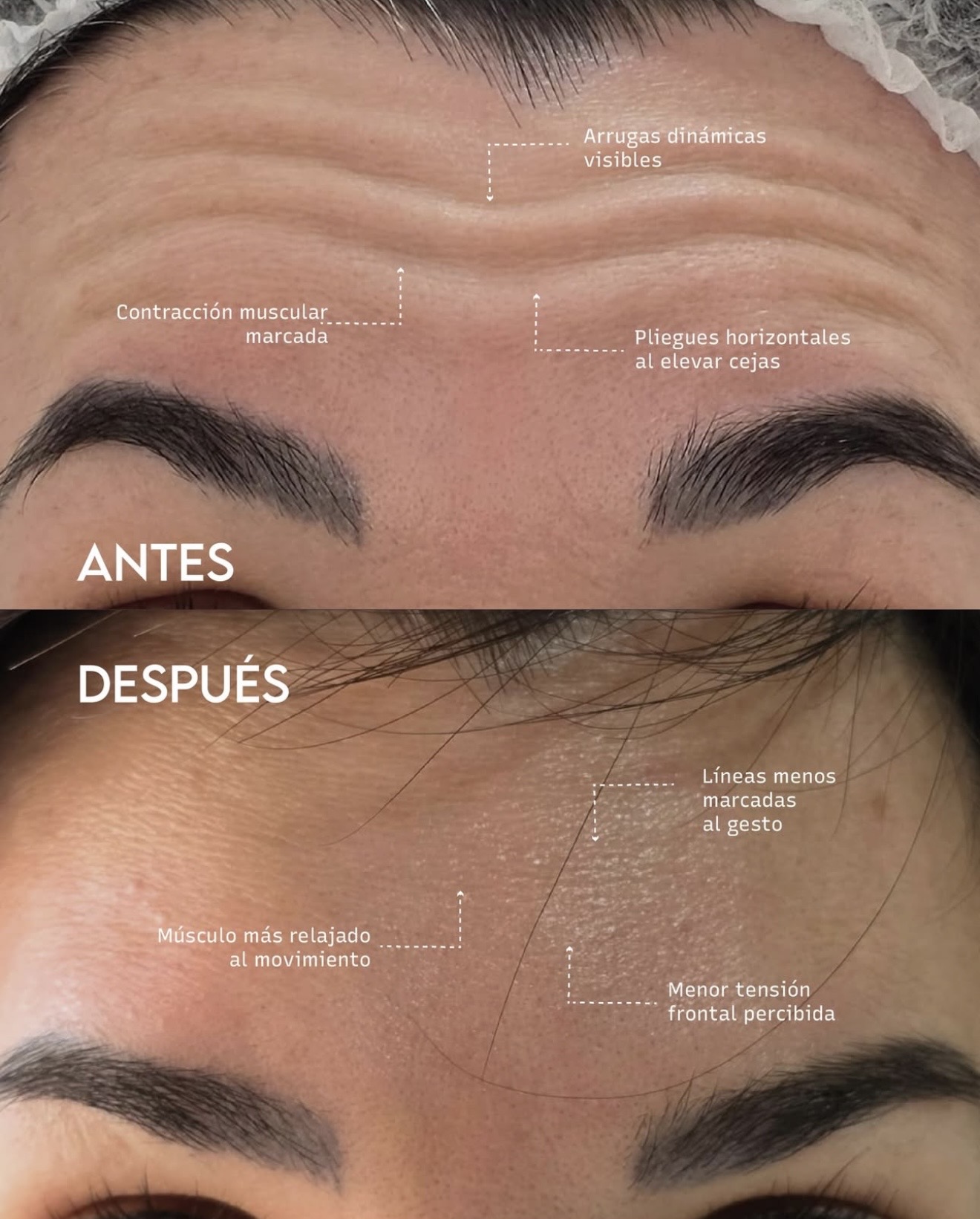 Al disminuir la actividad muscular, las arrugas dinámicas se suavizan y la piel descansa, la expresión se percibe más relajada.